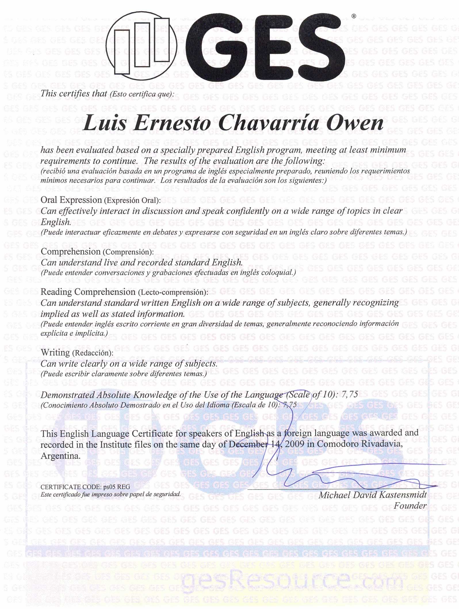 GES Resource ofrece una certificación de conocimientos en el uso del idioma inglés. La certificación consiste en un examen escrito y oral. El examen se realiza independientemente de cualquier curso tomado por el alumno o institución donde haya estudiado. Los estudiantes regulares del Instituto dan exámenes y reciben certificaciones en diciembre de cada año. En el caso de cursos especiales, los estudiantes dan exámenes y reciben certificaciones al finalizar el curso.
